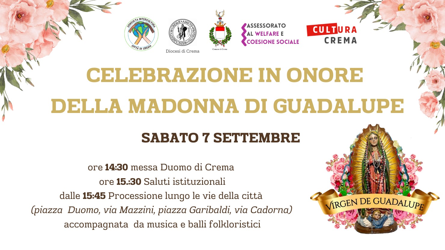 La comunità latinoamericana di Crema e del cremasco si appresta a celebrare la Virgen de Guadalupe nella giornata di sabato 7 settembre. La terza edizione della manifestazione inizierà alle ore 14.30 con la messa in Duomo a cui seguiranno le danze itineranti di otto gruppi fino al parco del Serio, in via Miglioli 23, dove si potranno degustare alcuni piatti tipici della cucina sudamericana.