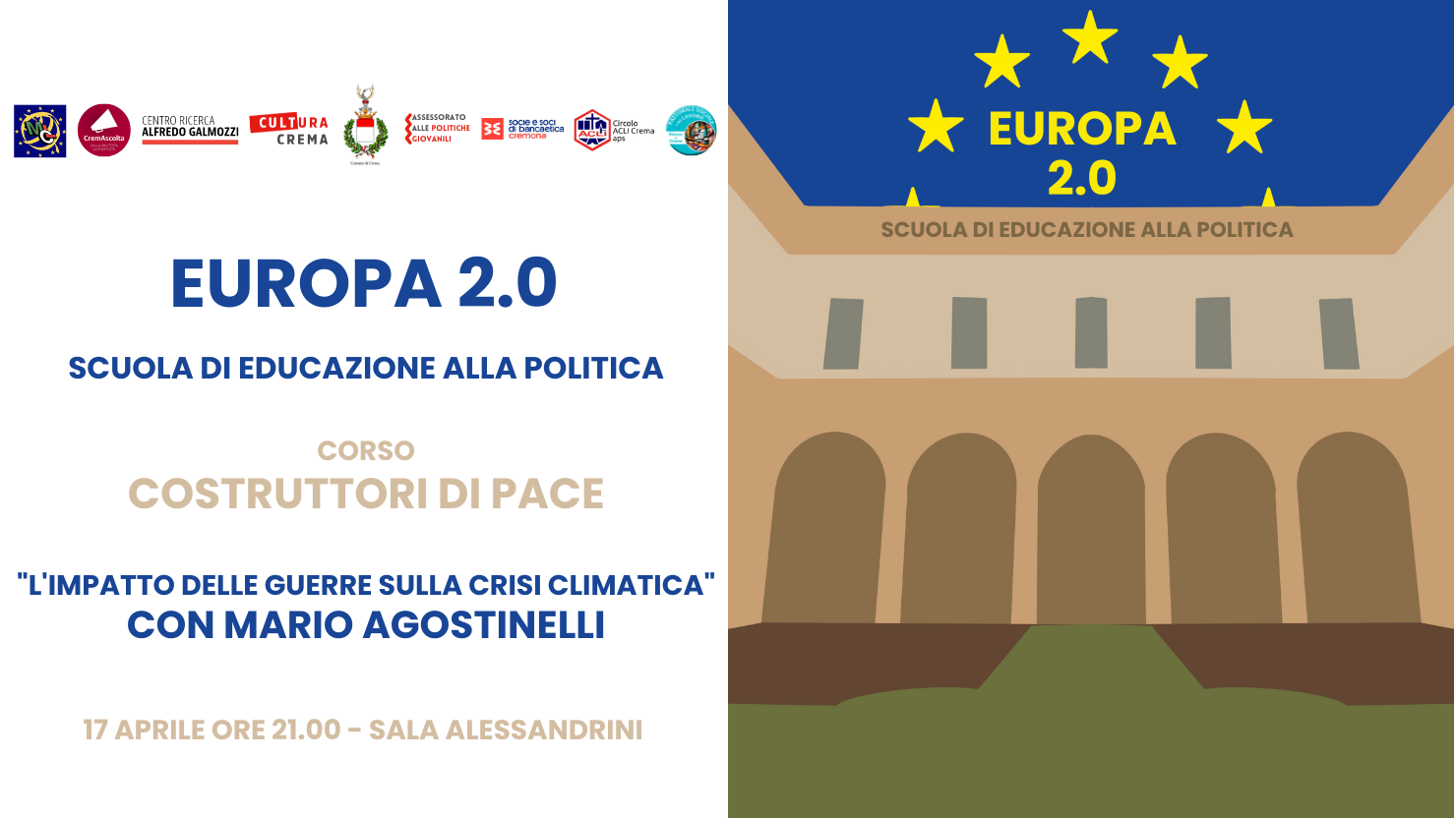 Dopo 5 edizioni, la Scuola di economia nata da un’idea di CremAscolta, in collaborazione con altre realtà cittadine (CREMASCOLTA, ACLI, BANCA ETICA, CENTRO GALMOZZI, MCL, PASTORALE SOCIALE DEL LAVORO) e organizzata da sempre in collaborazione con l’Amministrazione comunale, evolve naturalmente nella scuola di educazione alla politica EUROPA 2.0.