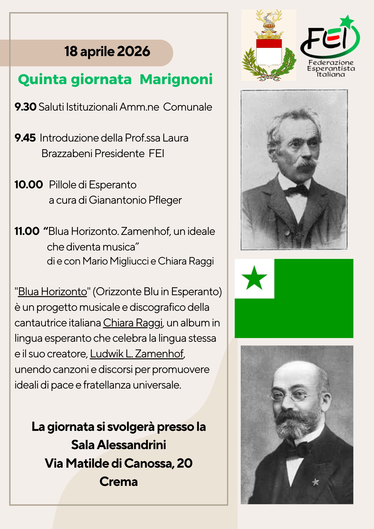 Il programma prevede, alle 9.30, i saluti istituzionali dell’amministrazione comunale, seguiti dall’introduzione della presidente FEI, Laura Brazzabeni. Alle 10.00 si terrà l’intervento “Pillole di Esperanto” a cura di Gianantonio Pfleger. La mattinata proseguirà alle 11.00 con la presentazione del progetto musicale “Blua Horizonto. Zamenhof, un ideale che diventa musica”, con Mario Migliucci e Chiara Raggi, dedicato alla lingua internazionale e al suo ideatore Ludwik L. Zamenhof.
