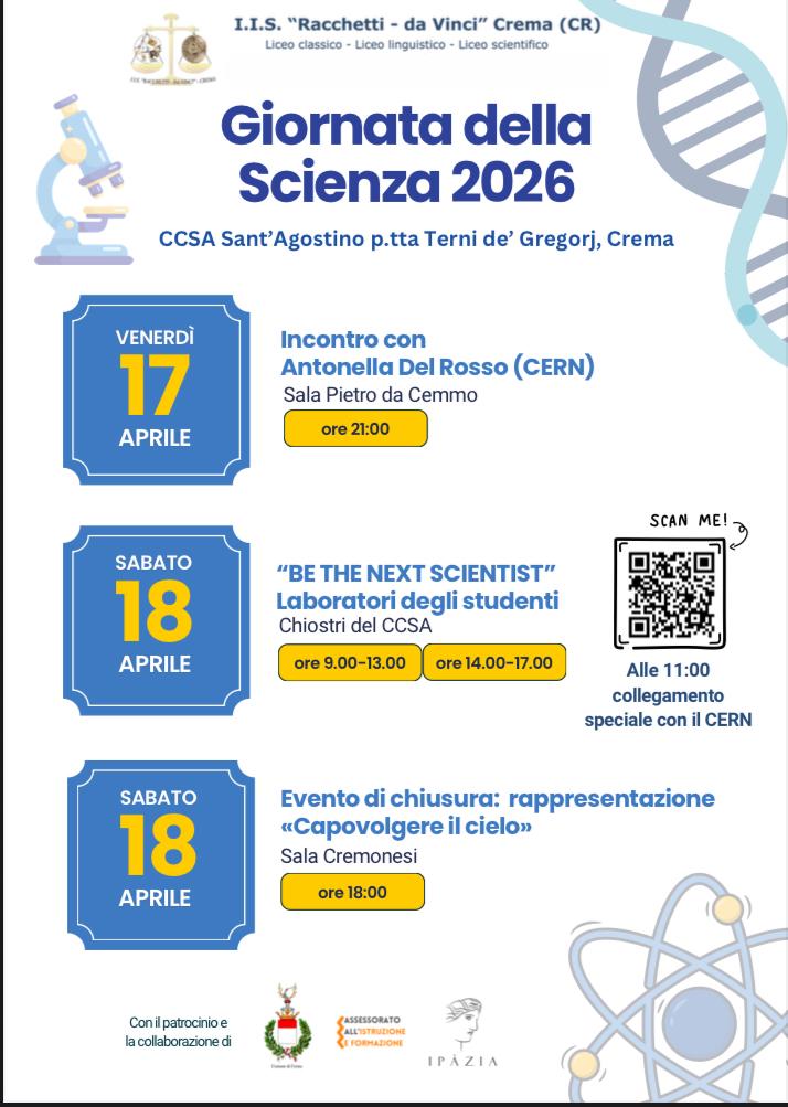 Partirà venerdì 17 aprile alle 21 in sala Pietro da Cemmo, l’edizione 2026 della Giornata della Scienza, che proseguirà sabato 18 aprile, con l’esposizione dei lavori degli studenti. Un’iniziativa consolidata e ormai inserita nel cartellone delle attività del Liceo Racchetti-da Vinci di Crema, testimoniato dal prestigioso premio ITP I Vostri Successi – Valore Sociale, assegnato nel 2022 dal CERN.