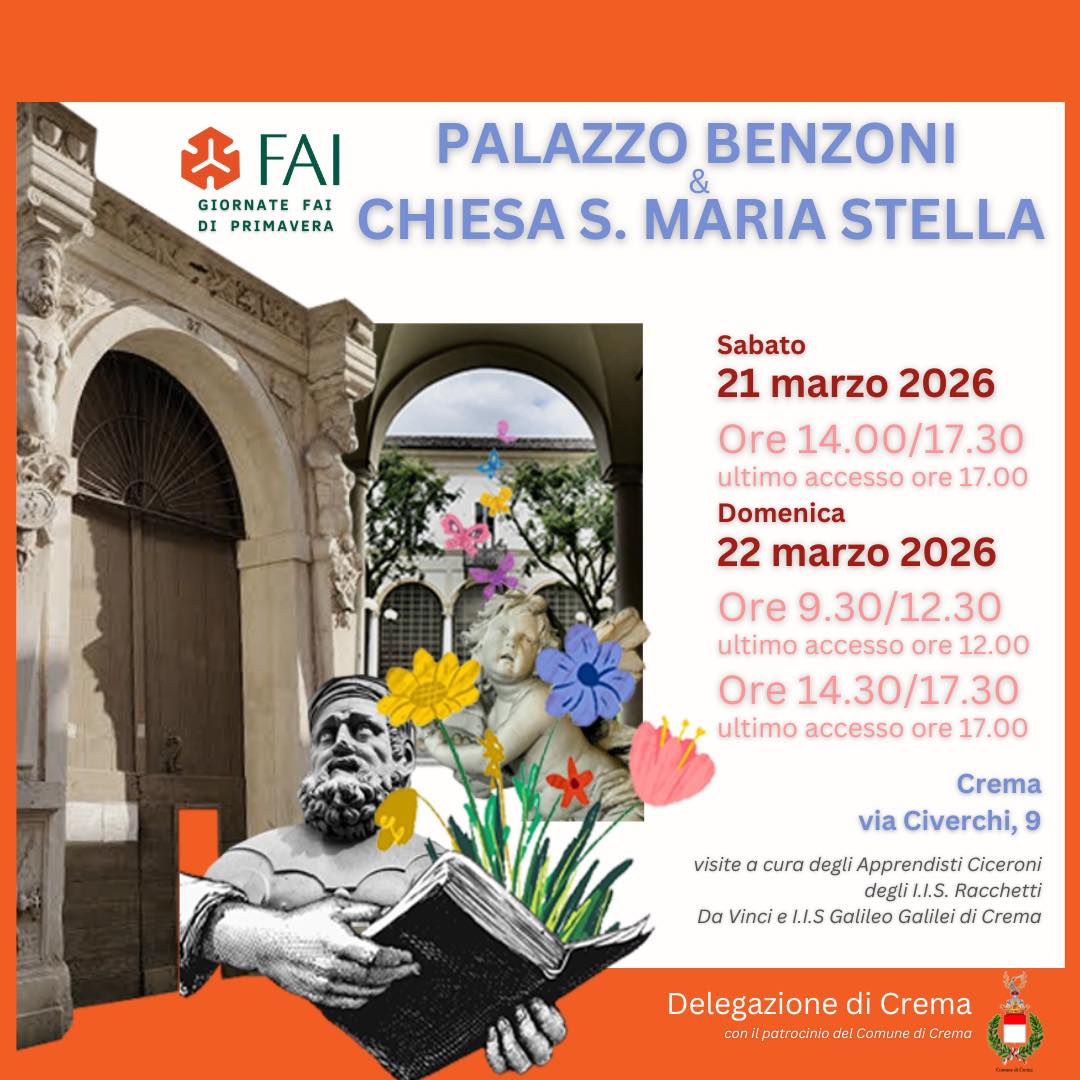 Anche quest’anno tornano le tanto attese Giornate FAI di primavera! Non perdere l’occasione di vivere una giornata speciale alla scoperta di Palazzo Benzoni, oggi sede della biblioteca civica di Crema in pieno centro storico, e della piccola Chiesa di Santa Maria Stella ricavata dall’adattamento del piano primo di un edificio civile nel 1800 ca.