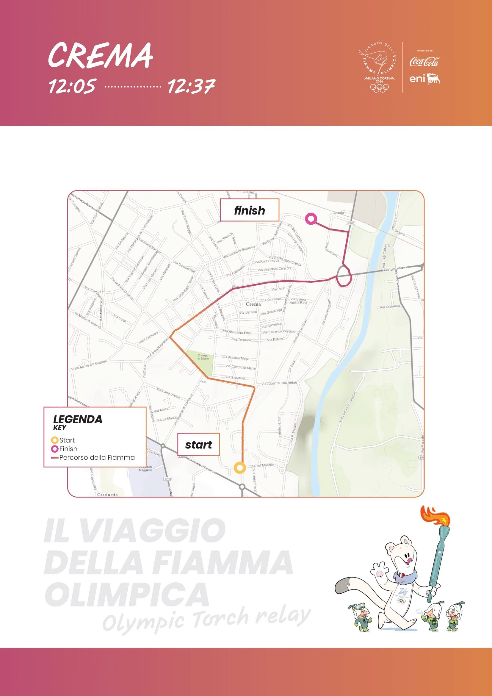 Per accompagnare l’arrivo della Torcia Olimpica, il Comune di Crema ha previsto l’allestimento di tre punti dedicati lungo il tracciato cittadino: piazza Giovanni XXIII, piazza Duomo e piazza Garibaldi. Spazi che diventeranno luoghi di incontro e condivisione, pensati per permettere a cittadini e visitatori di vivere da vicino l’emozione del passaggio della Fiamma.