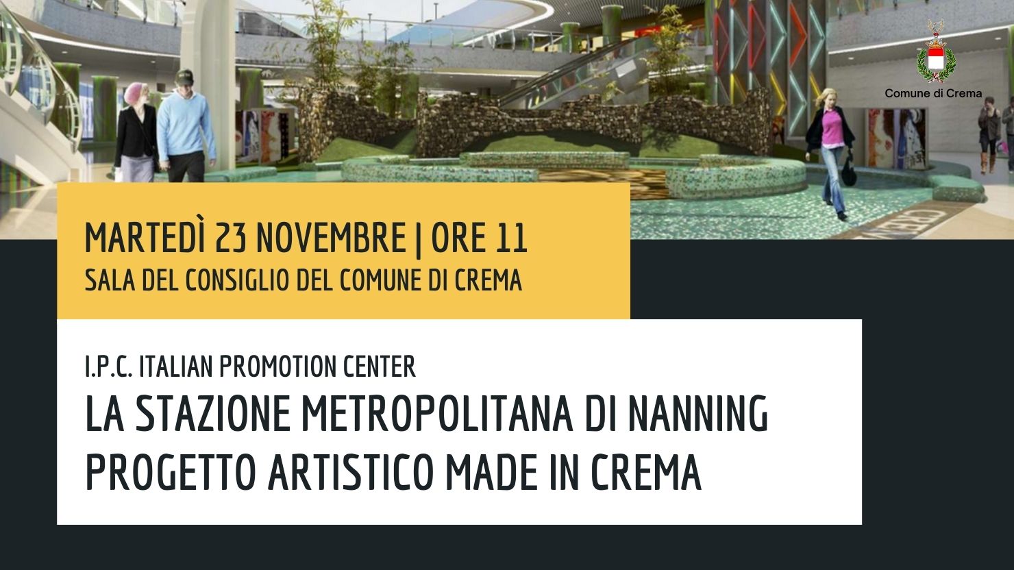 Nell’ambito del gemellaggio siglato nel settembre del 2017 tra le città di Crema e di Nanning, è stato approvato ed è in fase di ultimazione esecutiva il progetto della realizzazione architettonica e artistica di spazi esterni alla IV° Stazione Metropolitana di Nanning, finanziato dalla città di Nanning, la cui inaugurazione è prevista entro metà gennaio 2022.